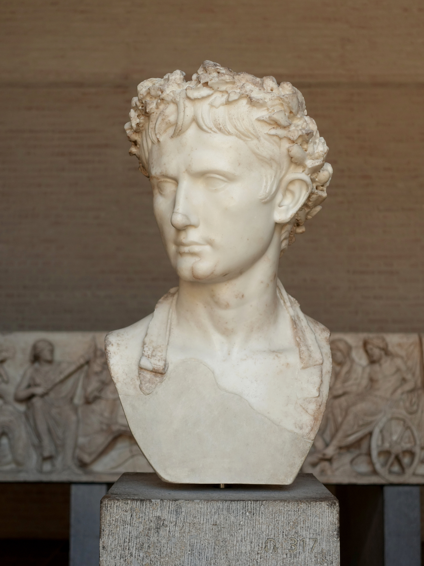 Das Haupt des Kaisers Augustus ziert die sog. „Bürgerkrone“ (lat. corona civica), eine Krone aus Eichenblättern, die ihm 27 v. Chr. vom Senat dafür verliehen wurde, dass er durch Beendigung des Bürgerkrieges die römischen Bürger gerettet hatte.