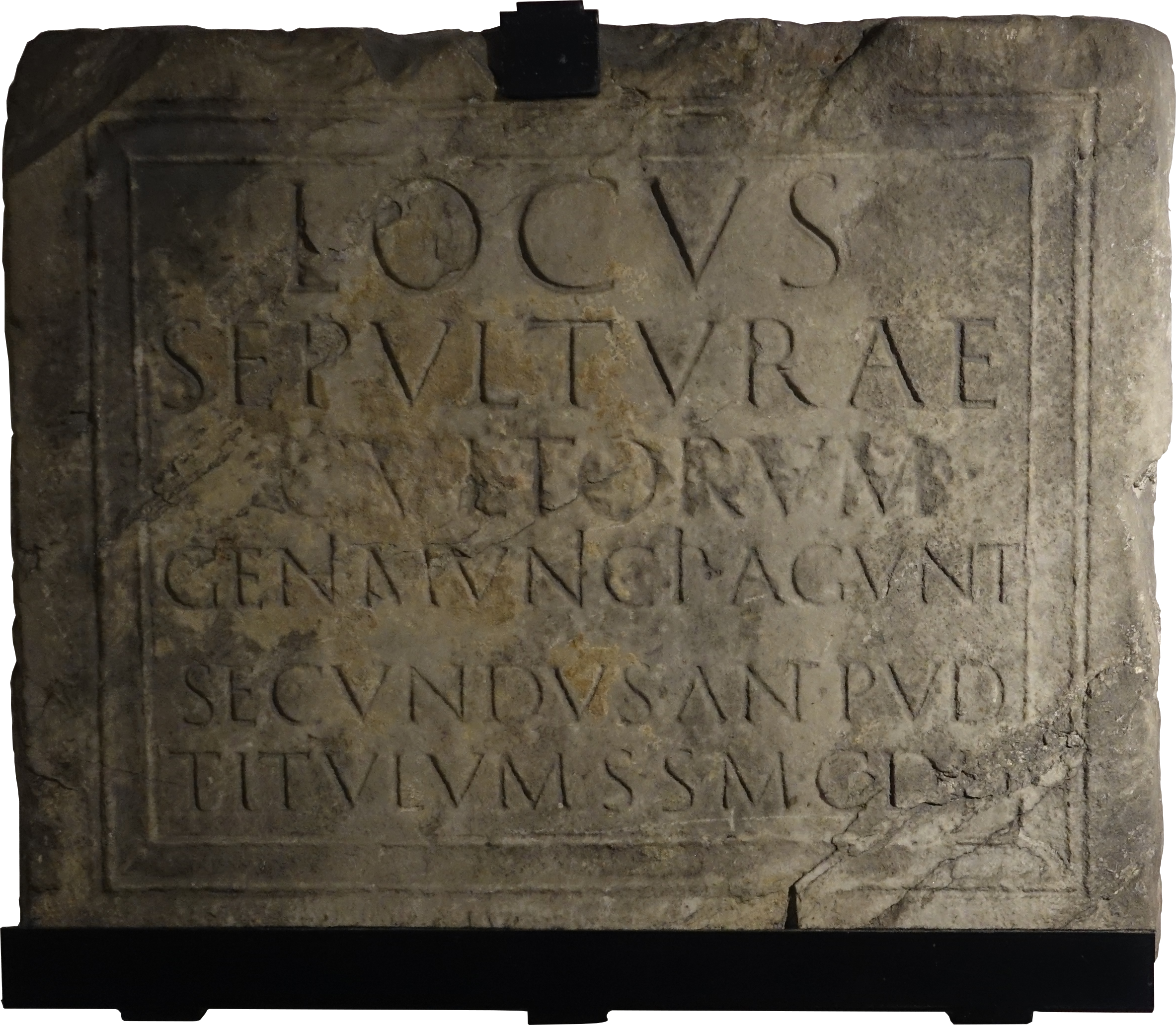 Locus / sepulturae / cultorum / Geni(i) municipi(i) Agunt(ensium). / Secundus … / titulum s(…) s(…) c(…) d(…) d(…). / Iuc[…