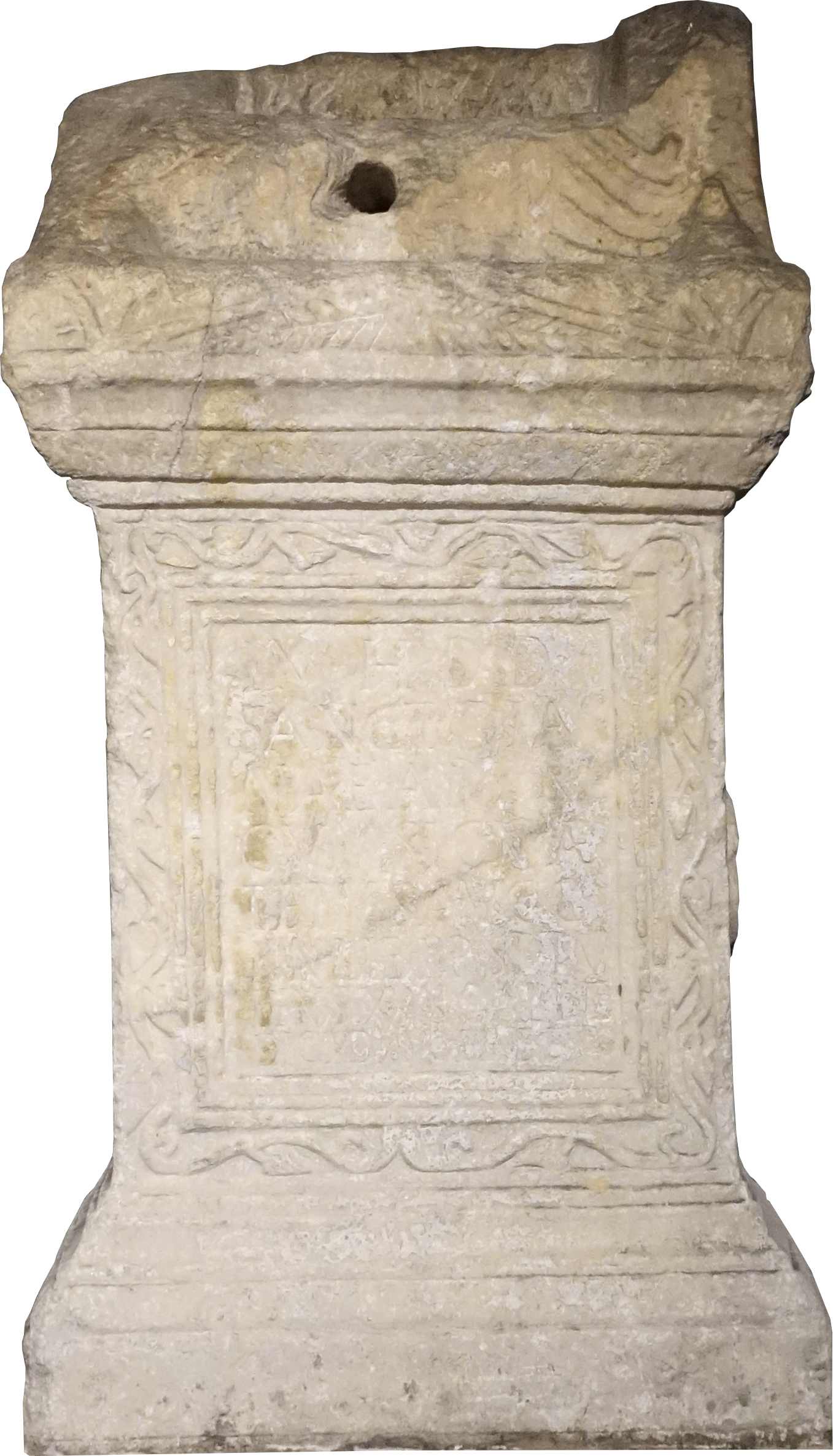 Schriftfeld von Efeuranken umrahmt. Auf der linken Seite ist ein Opferkrug (urceus), auf der rechten eine Opferschale (patera) dargestellt.