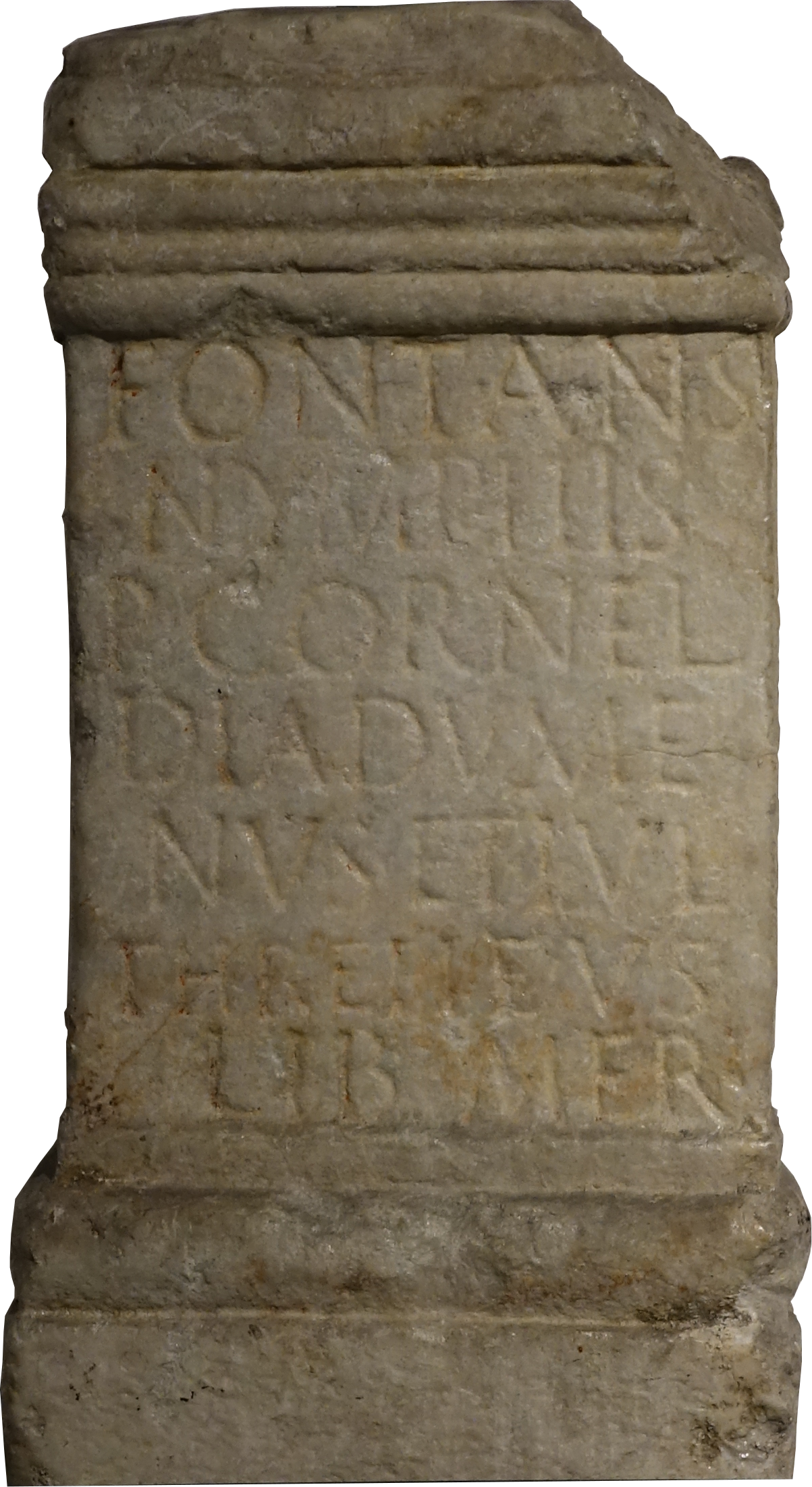 Fontanis / Nymphis. / P(ublius) Cornel(ius) Diadume/nus et Iul(ia) / Threpte v(otum) s(olverunt) lib(entes) mer(ito).