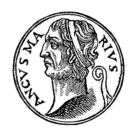 (4) Portrait von Ancus Marcius, des vierten Königs von Rom, aus dem Promptuarium Iconum Insigniorum von Guillaume Rouillé (1553). Gemeinfrei
