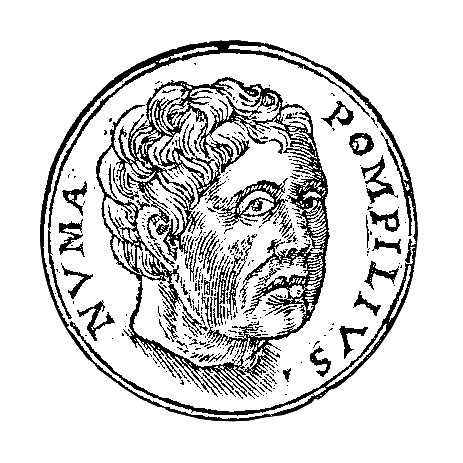 (2) Portrait von Numa Pompilius, des zweiten Königs von Rom, aus dem Promptuarium Iconum Insigniorum von Guillaume Rouillé (1553). Gemeinfrei