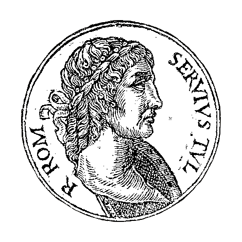 (6) Portrait von Servius Tullius, des sechsten Königs von Rom, aus dem Promptuarium Iconum Insigniorum von Guillaume Rouillé (1553). Gemeinfrei