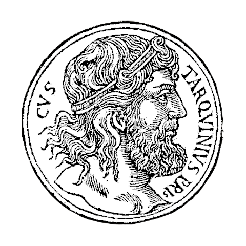 (5) Portrait von Tarquinius Priscus, des fünften Königs von Rom, aus dem Promptuarium Iconum Insigniorum von Guillaume Rouillé (1553). Gemeinfrei